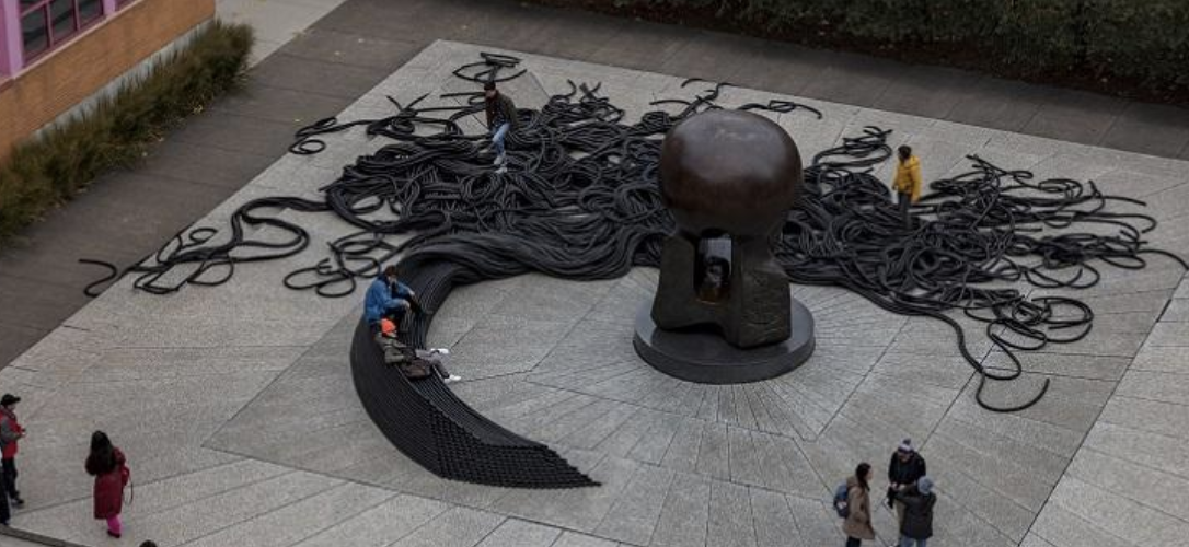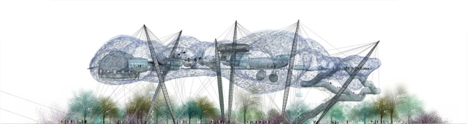 I like Saraceno's idea of allowing visitors to get a bird's eye view of the world we live in, where the people below appear as tiny figurines. It's an alternative view of the world in which only the bravest, (those without a fear of heights) can manage to see. Similar to Saraceno, my design also acts in a similar way, allowing office workers in particular, to step away from their tedious amounts of work and use the trampoline park as an escapism. Likewise, I aim to use netting in a similar fashion, surrounding the space, displaying wave-like forms throughout.