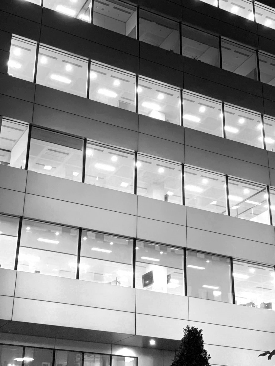 Glass (double glazed) floor to ceiling windows - perhaps green tinted to suit the eco-friendly theme. Massive windows to allow as much natural light into the property as possible (as sunlight may be blocked at certain times due to the large buildings either side).