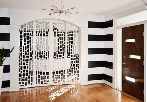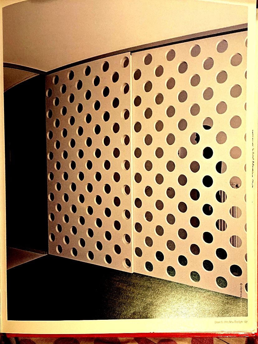 "The substitution of traditional hinges for axes and modern fittings allows for non- orthogonal geometrical door designs, which as such emerge as a significant design element for the interior".